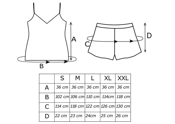 Čierne saténové pyžamo Sheila 1/2 je vyrobené z 98 % polyesteru a 2 % elastanu. Materiál je hladký a lesklý, čo zaručuje luxusný vzhľad. Pyžamo má béžovo-čiernu farbu a vzor zebry. Vrchná časť má tenké ramienka s výstrihom do V. Nohavice sú krátke. Tento model sa dá ľahko zladiť s ďalšími kúskami, ako je napríklad župan Sheila.